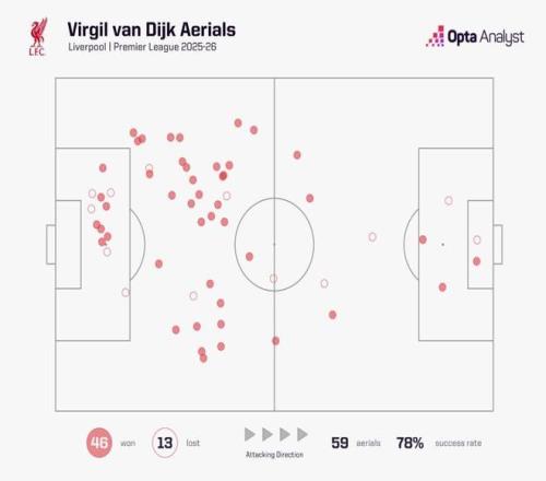 问题是本赛季的范迪克在这方面的效率大幅下降,哪怕数据上看,59次高球一对一赢下46次,成功率高达78%,但实际上对于落点的控制却大不如前。