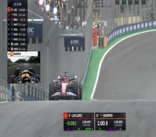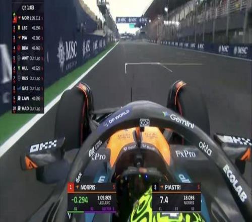 Q3首轮飞驰圈结束,皮亚斯特里领先勒克莱尔0.002秒暂居榜首,两台梅赛德斯排在第4&第5;